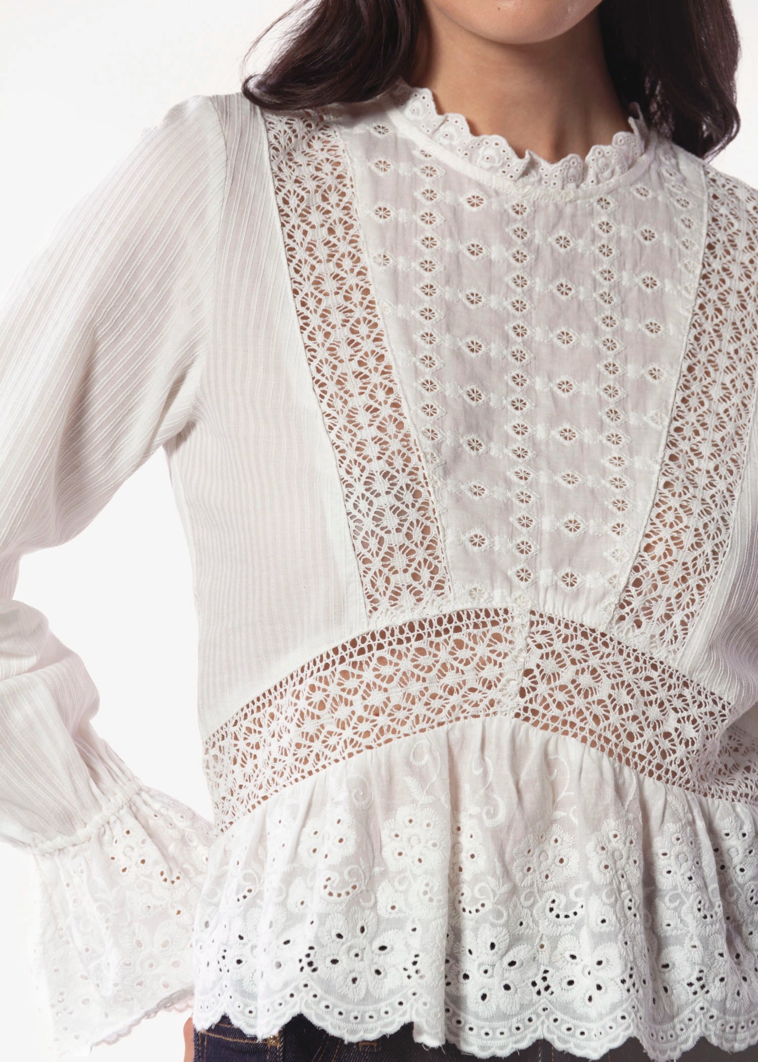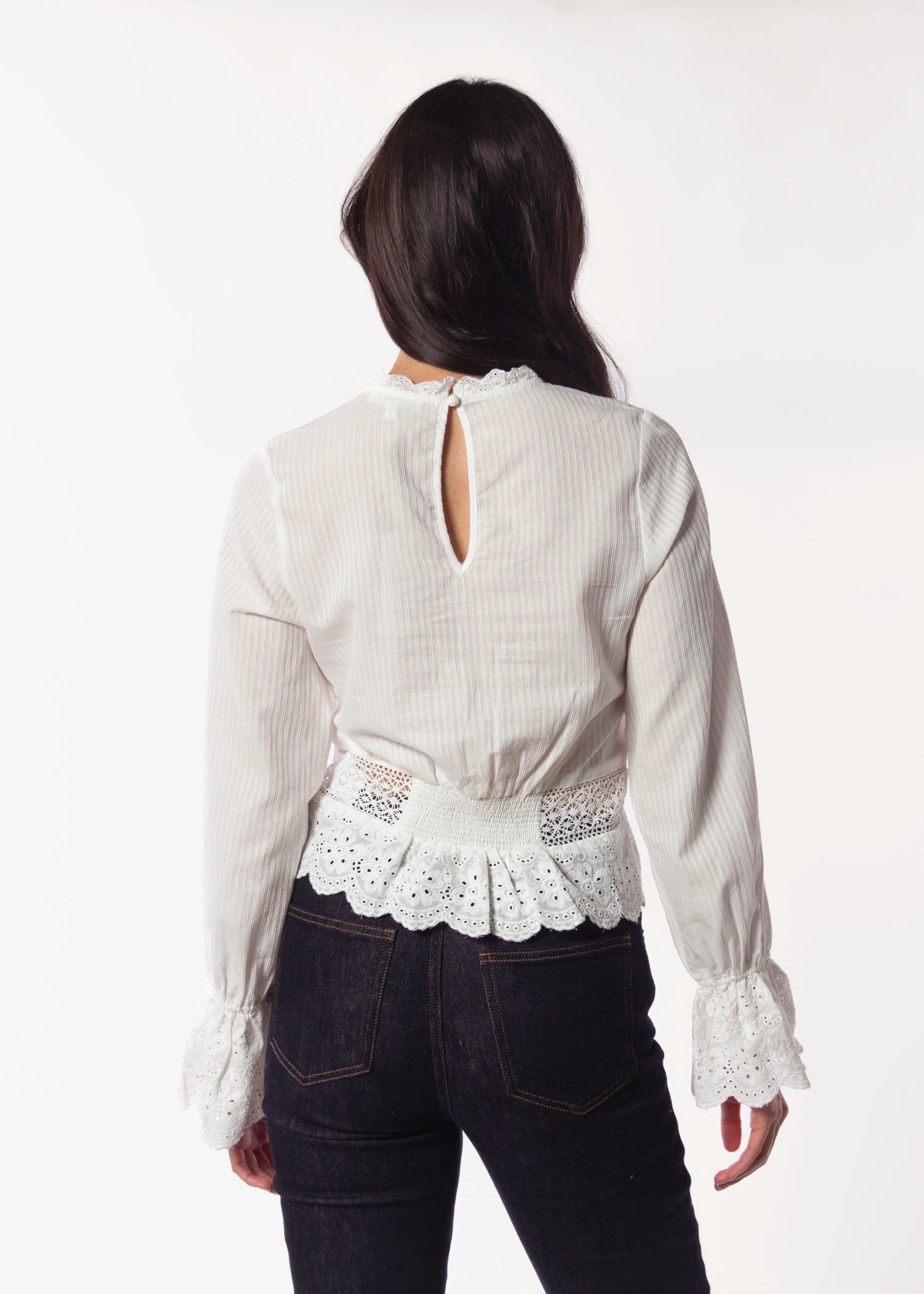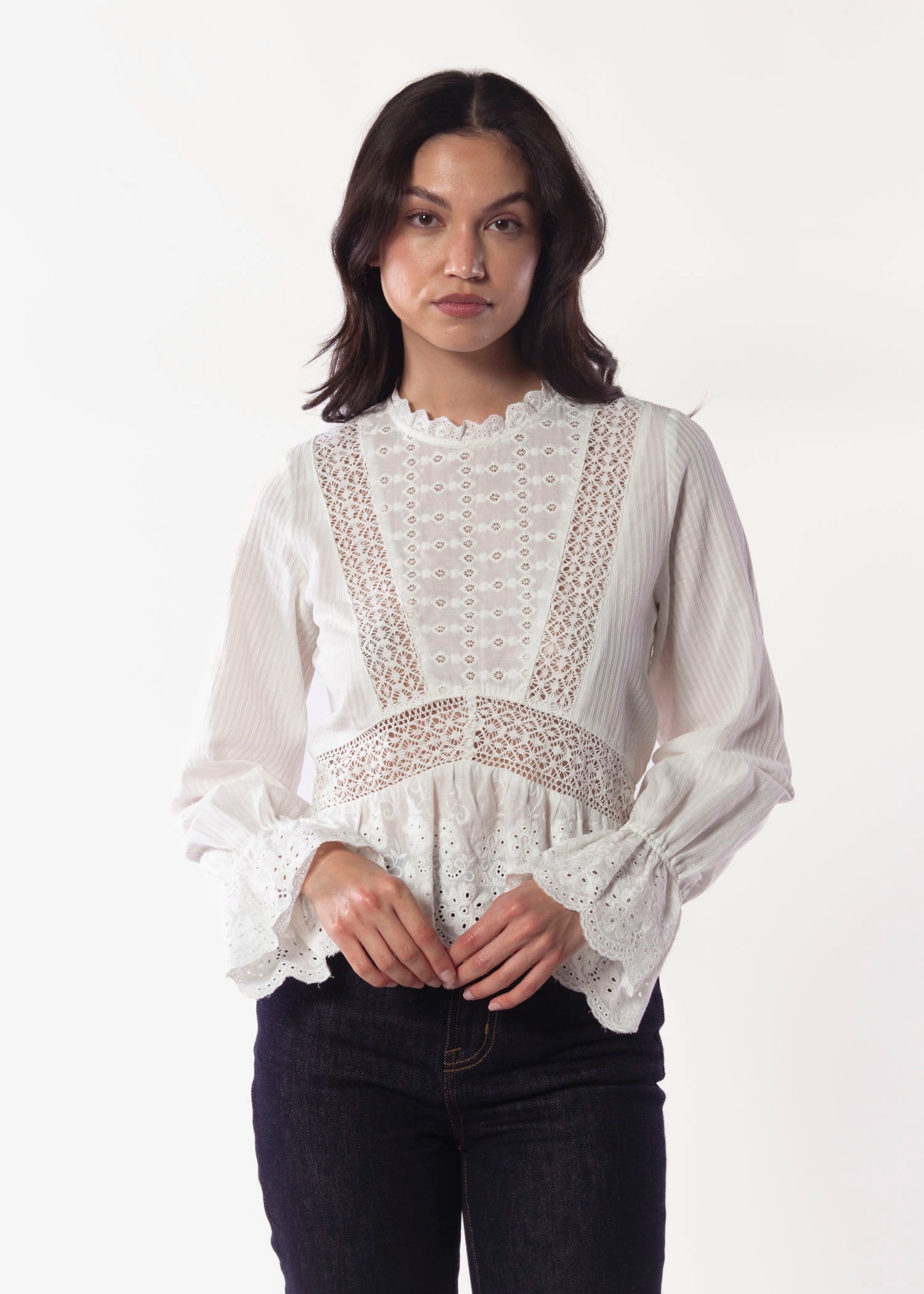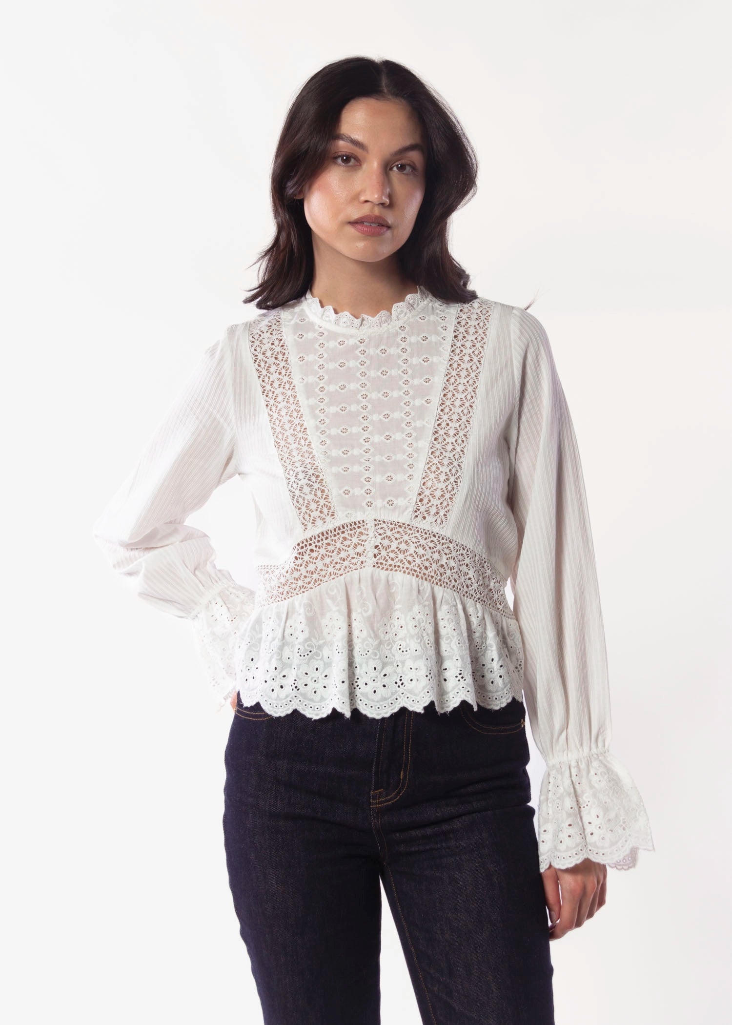 Made from a washed, cotton voile, the Miriam Blouse is adds a feminine touch to any look. It features inset lace panels and an eyelet hem.