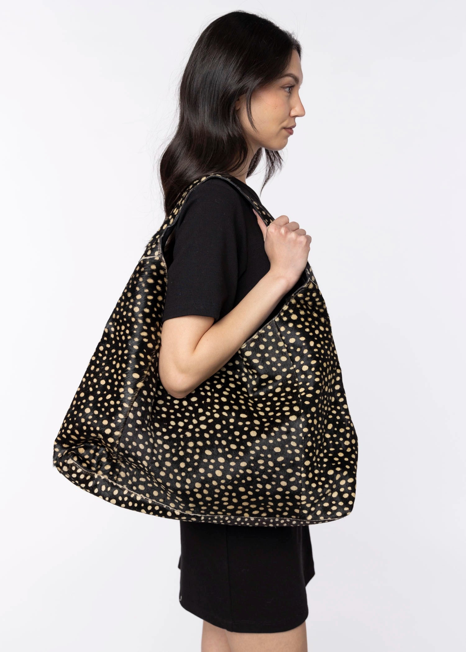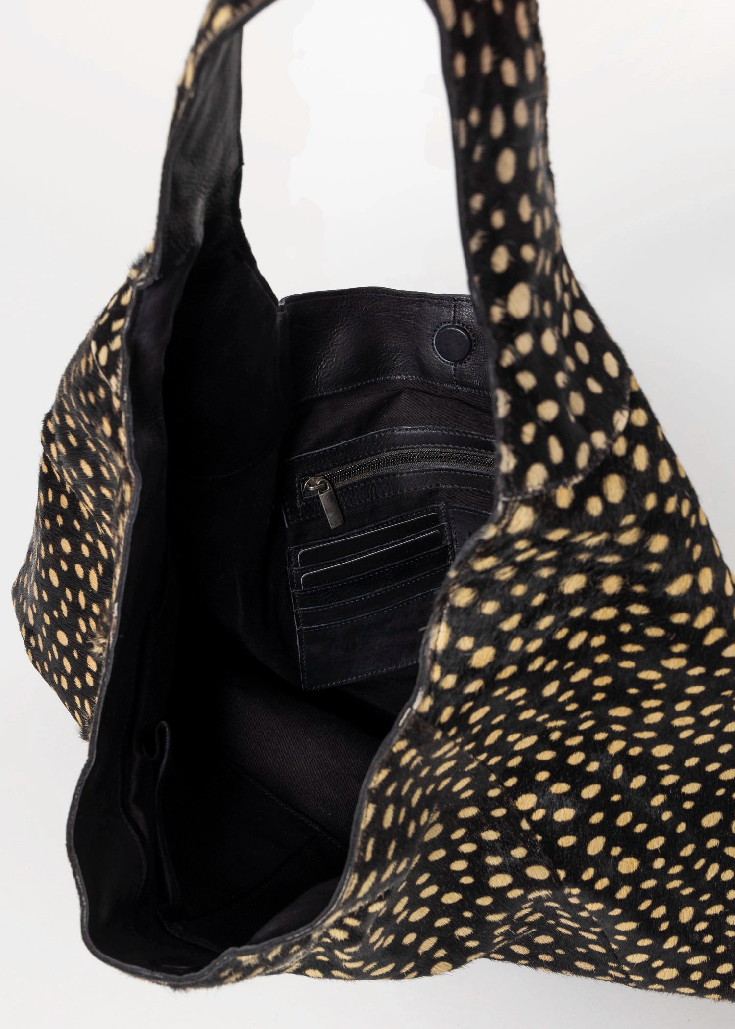 Lindsey’s relaxed, easy-to-carry hobo style features authentic cowhair exterior, a well-organized spacious interior with a water bottle holder, key leash, lipstick + credit card holders, and a zip pocket. Your go-to, throw-all tote bag.