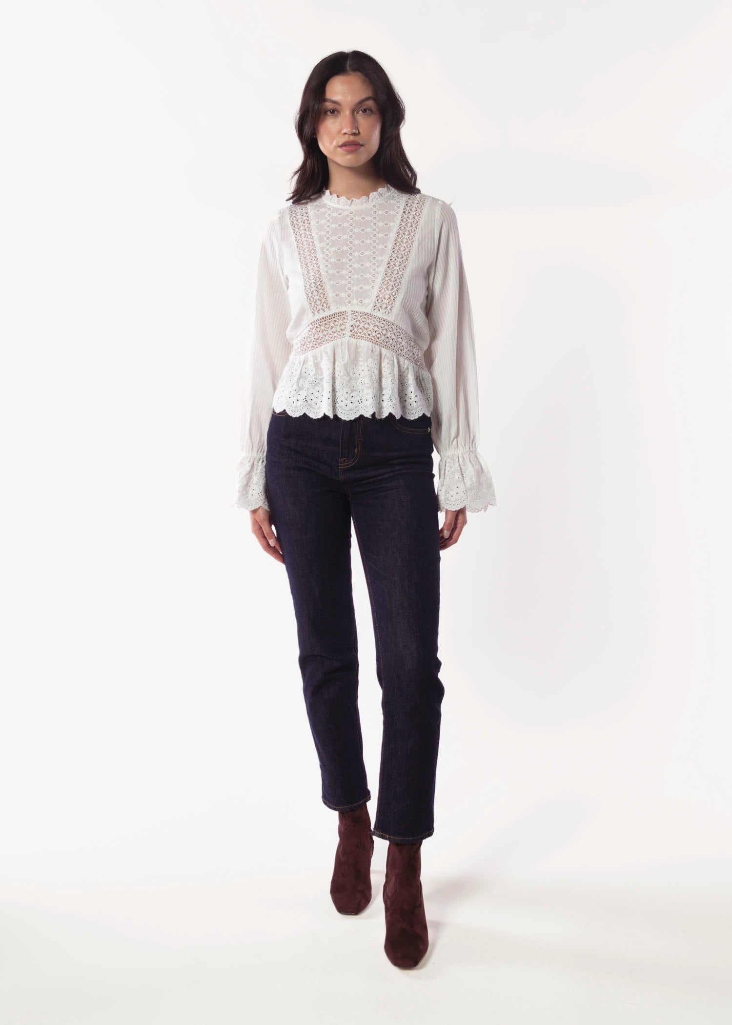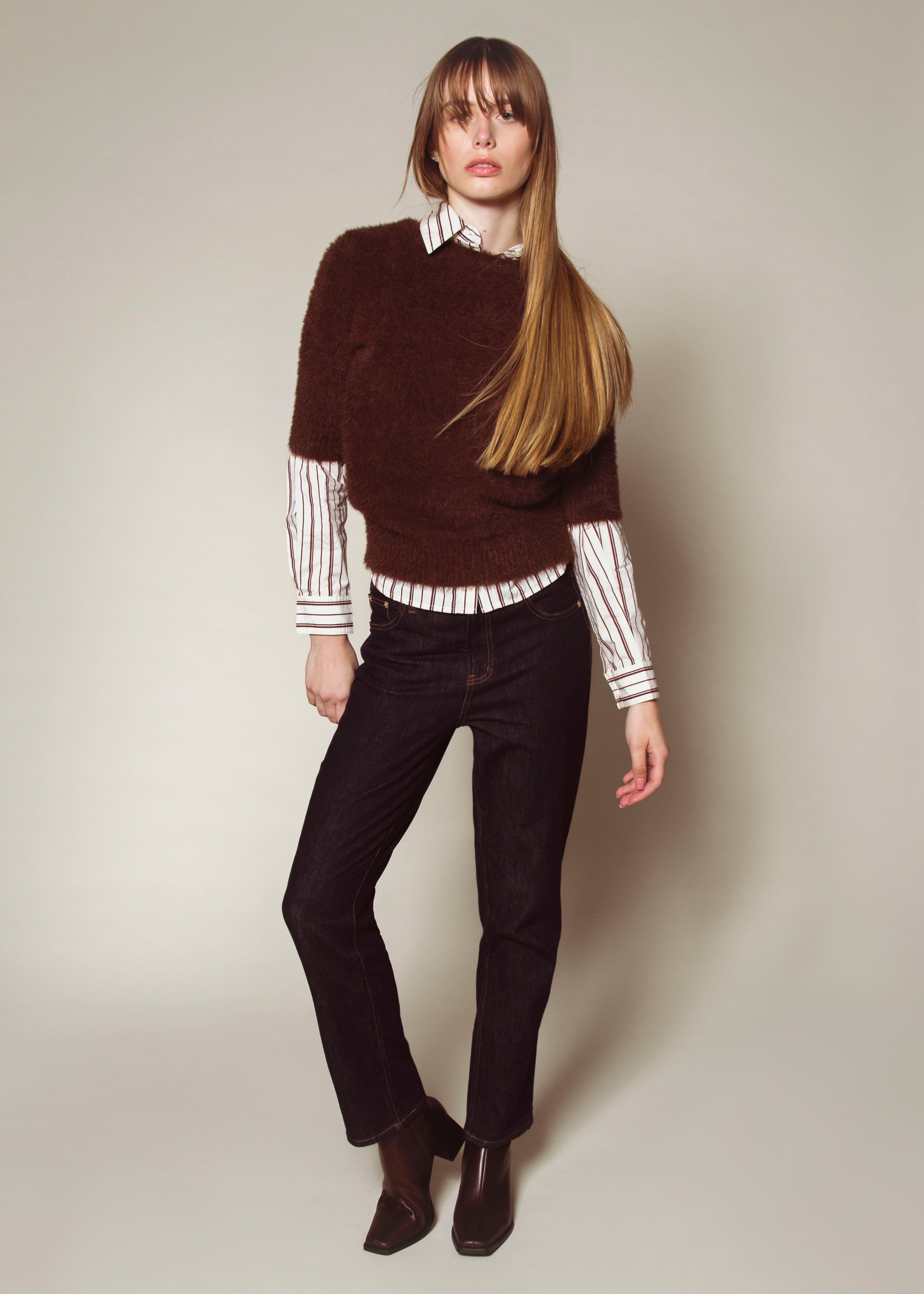 The Bri jean sits comfortably at a high rise and features a slim straight leg that hits at ankle length. The dark wash is perfect for fall.