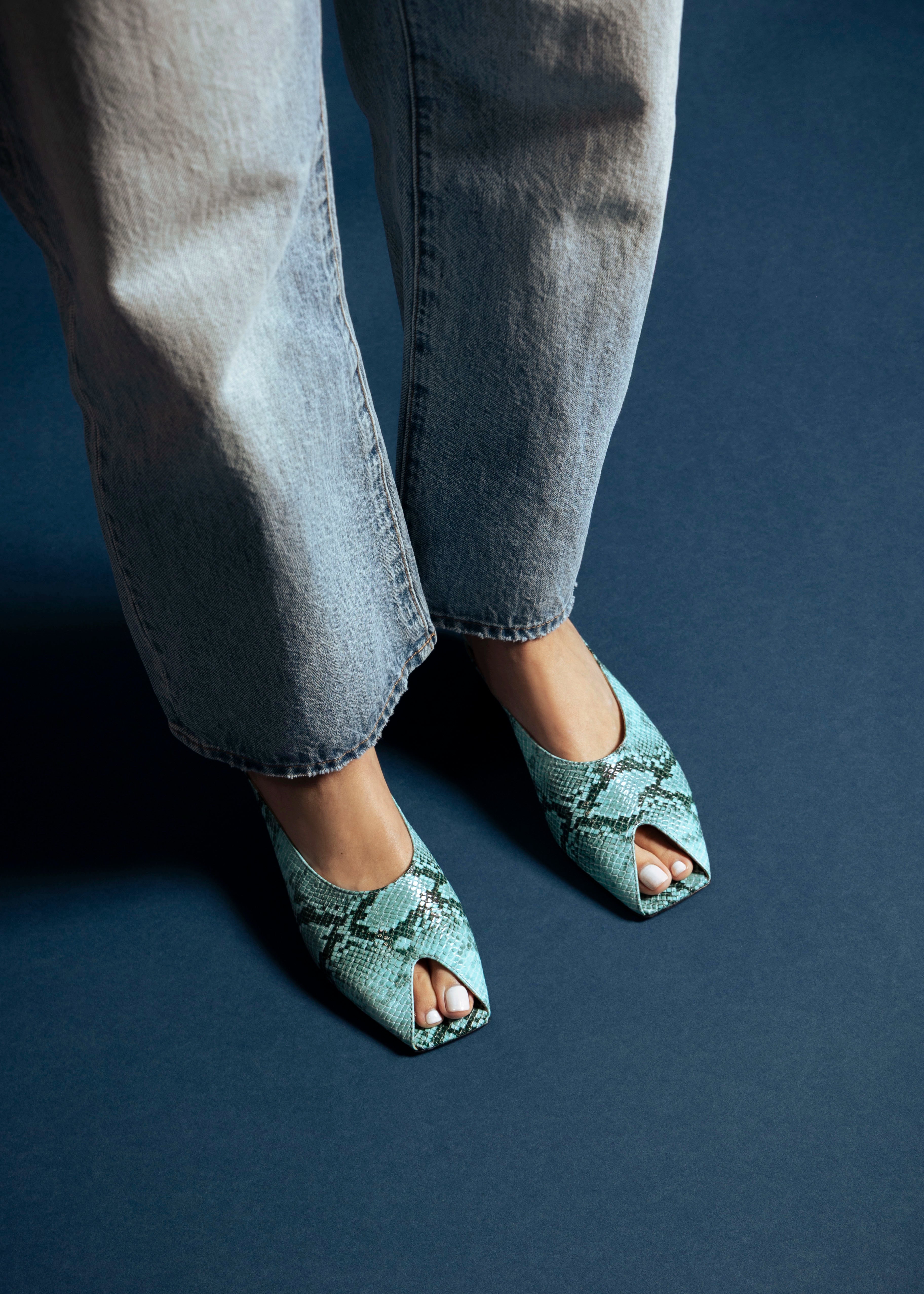 Get ready to make a statement this Spring. This all leather mule has a fresh new shape with a square toe and and triangular peep toe.