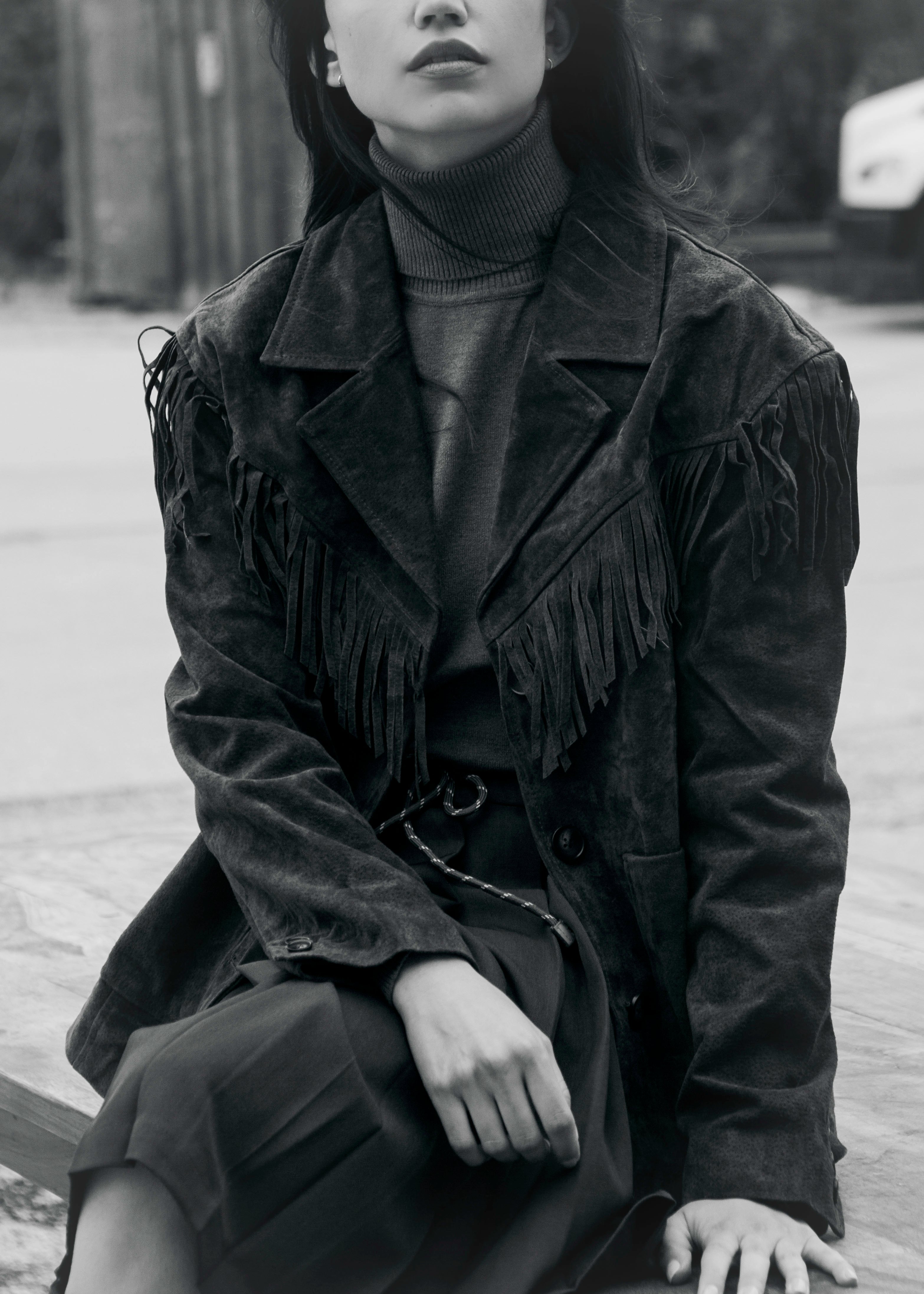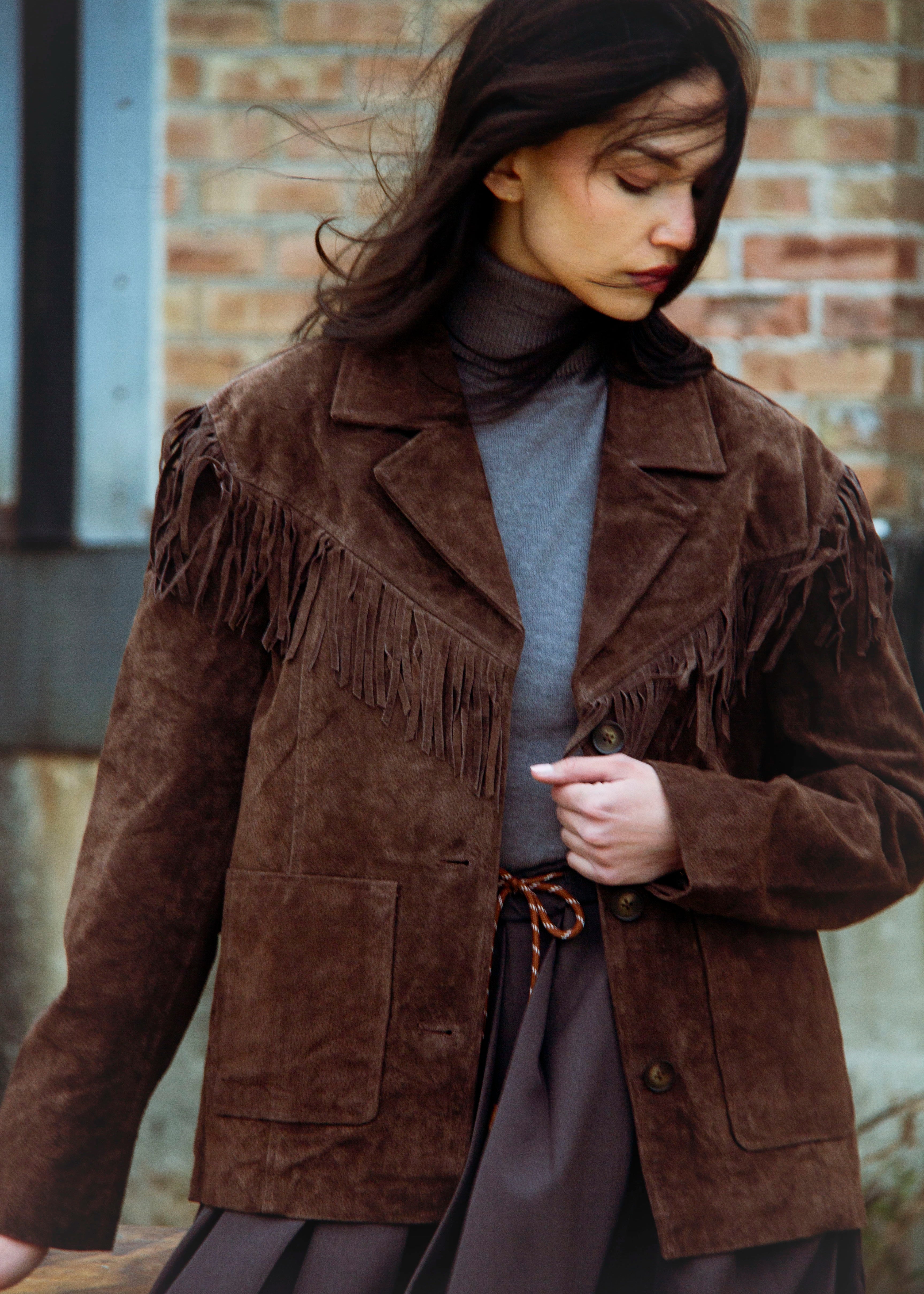 This rich chocolate suede jacket has a timeless silhouette, with a twist. The fringe adds a boho feel, and we love it with a feminine eyelet blouse.