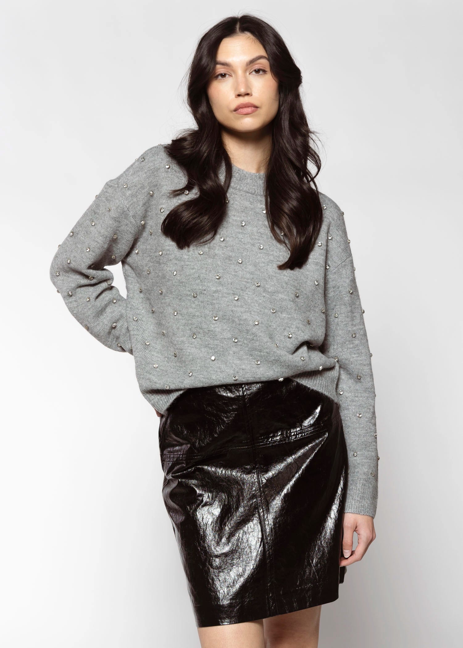The Broadway is a faux leather mini skirt with a crinkled patent look. Wear it with your favorite sweater or blouse for the perfect holiday look.